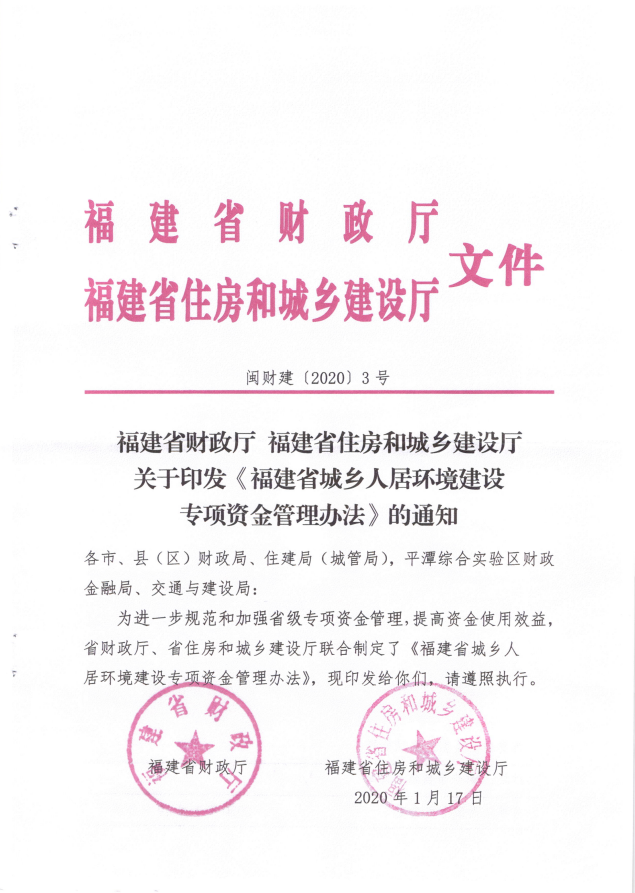 福建省財政廳福建省住房和城鄉(xiāng)建設廳關于印發(fā)《福建省城鄉(xiāng)人居環(huán)境建設專項資金管理辦法的通知》(閩財建[2020]3號)